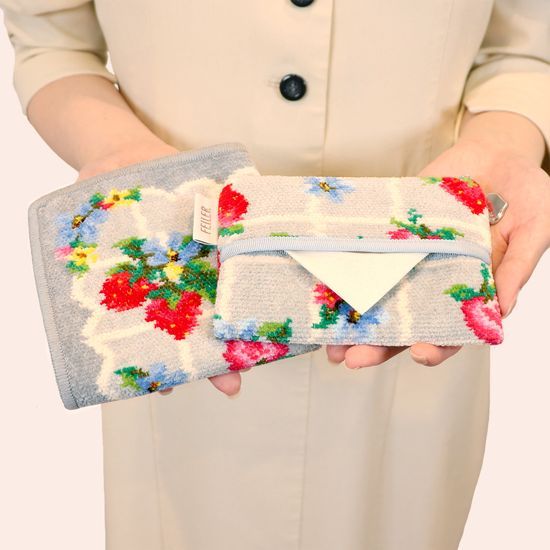 ときめきに包まれる夢見心地な「ストロベリーフィールドプティ」のハンカチ。チェック柄にちりばめた、小花といちごが愛らしいデザインです。スカラップレースのような縁取りも、華やかなアクセントに。優しく上品な色合いのハンカチは贈り物にもおすすめです。