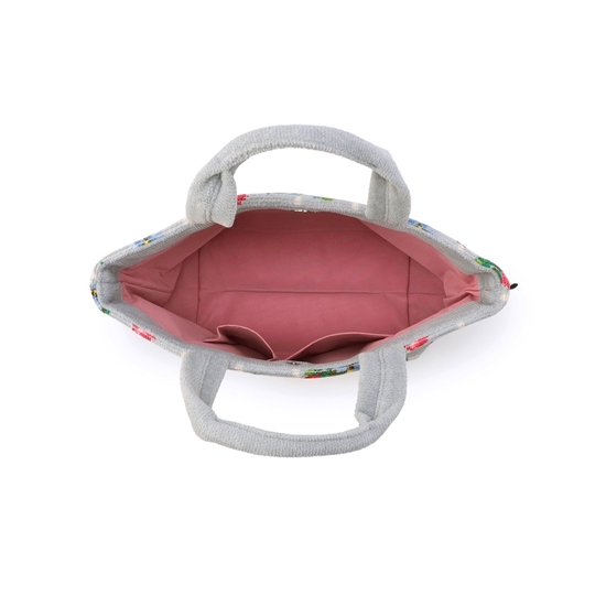 『ストロベリーフィールドプティ』のバッグです。マチが広いので見た目以上に収納力があります。ベースカラーをやわらかな雰囲気が漂うグレーにすることで、愛らしくて人気な柄に上品さをプラスしました。内側にオープンポケットが2つあり、小さなアイテムもしっかりと収納可能。ピンクの裏地で華やかに仕上げた内側にも注目です。マグネットで簡単に開閉できて、デイリーユースに重宝します。