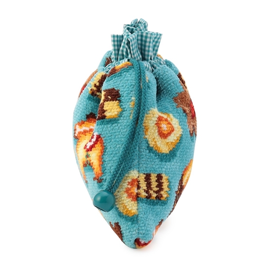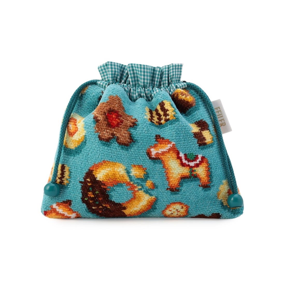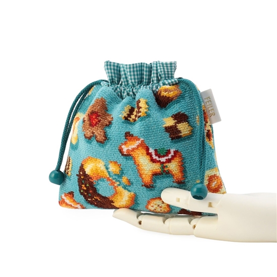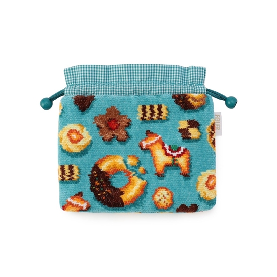 『フィーカタイム』の巾着です。おしゃれなテーブルクロスをイメージした、ターコイズブルーをベースカラーにすることで魅力的な表情に仕上げました。裏地や口元のフリルにギンガムチェック柄の生地を採用。コントラストの効いた色合いがアクセントに。細かなアイテムをまとめてかわいらしく収納でき、ギフトにもおすすめです。