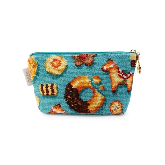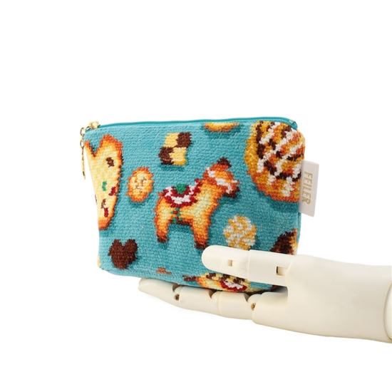 収納力と安定感を追求した『フィーカタイム』のポーチです。おしゃれなテーブルクロスをイメージした、ターコイズブルーをベースカラーにすることで魅力的な表情に仕上げました。手のひらサイズのコンパクトさがポイント。マチ幅がしっかりとある別底仕様で、中身が整理しやすいのも魅力のひとつ。内側にポケットもあり、小物の仕分け収納もできる使い勝手の良いアイテムです。