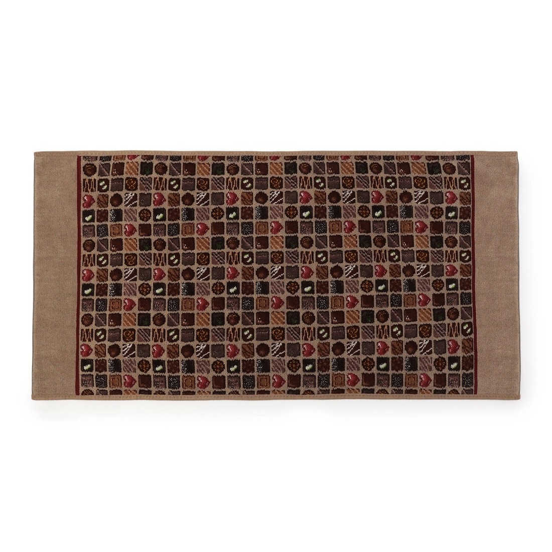 『コフレドゥショコラ』のスポーツタオルです。宝石のように美しい、高級感溢れるチョコレートを落ち着いた色彩で描きました。大人が肩に掛けても十分な長さで、お子様のお風呂上りに使用するタオルとしてもお使いいただけます。大切な方へのプレゼントにもおすすめしたい1枚です。
