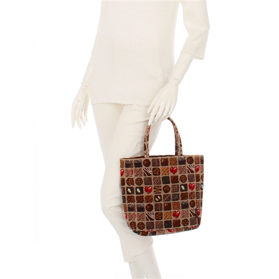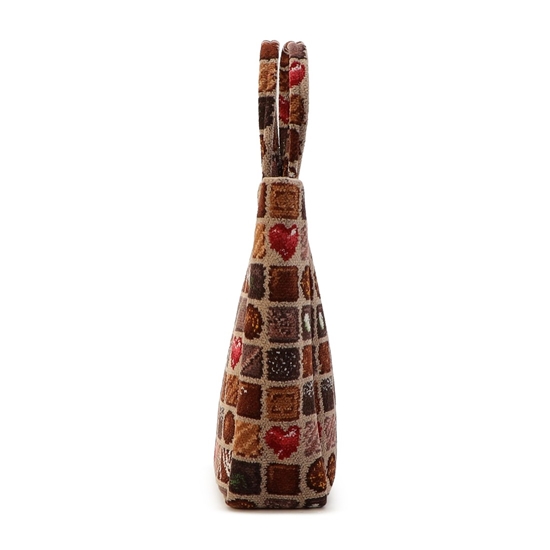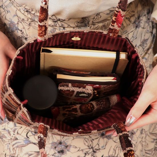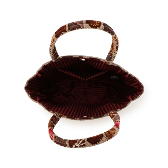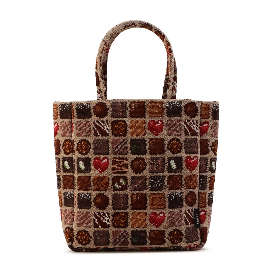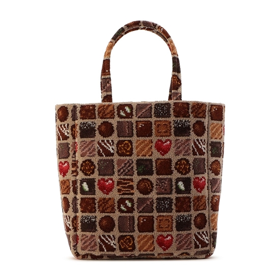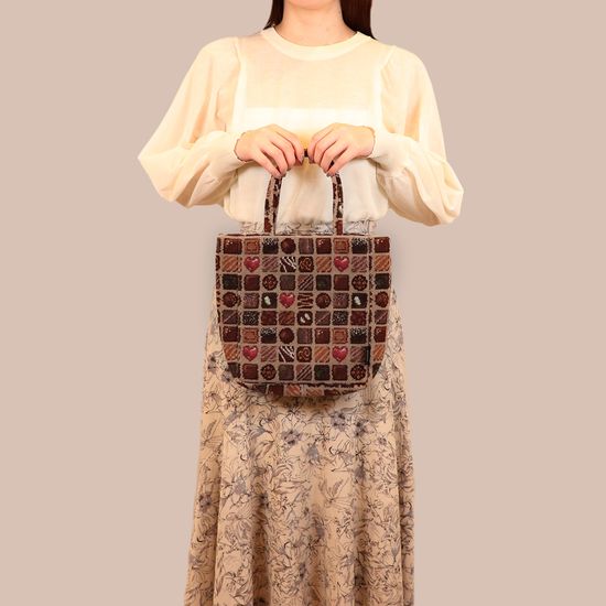 贅沢なアソートボックスをコンセプトに描いた『コフレドゥショコラ』のトートです。フォルムをあえてシンプルにすることで、柄の魅力を最大限に引き出す仕上がりに。内側にはポケットがあり、すぐに取り出したいアイテムや小物類もすっきり収納可能。コーディネートのアクセントにぴったりな、、華やかな雰囲気の一品です。