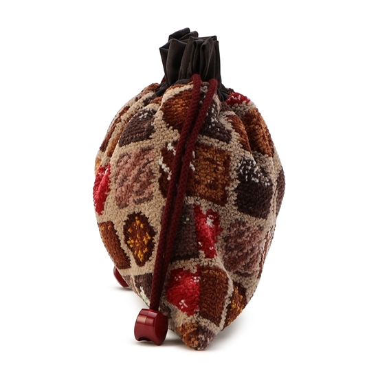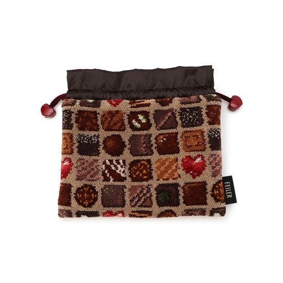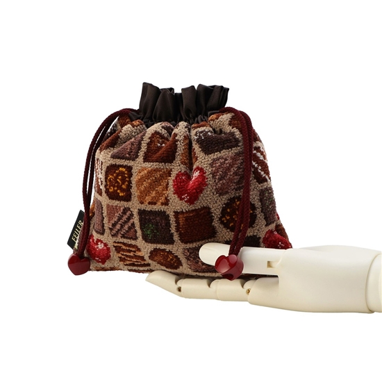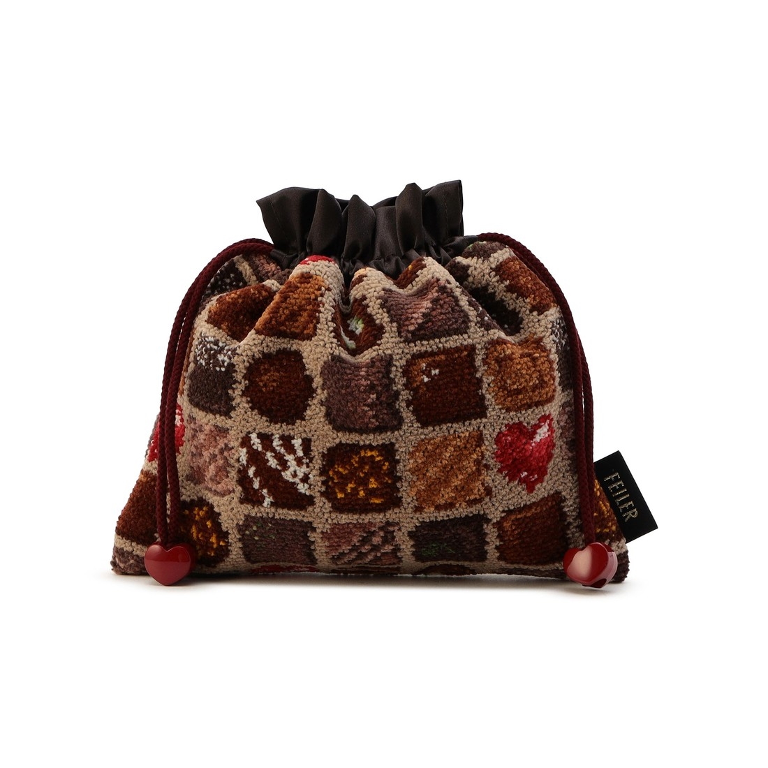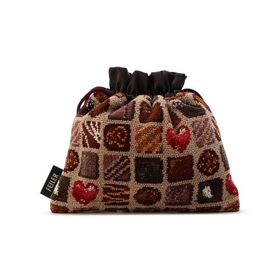 『コフレドゥショコラ』の巾着です。口元と裏地にサテン生地を採用することで、より華やかに仕立てました。巾着紐の先端にあしらった、ハート型のループエンドもアクセントに。日々のバッグの中の整理に、トラベルでの荷物の仕分けにと、幅広い用途で役立つアイテムです。