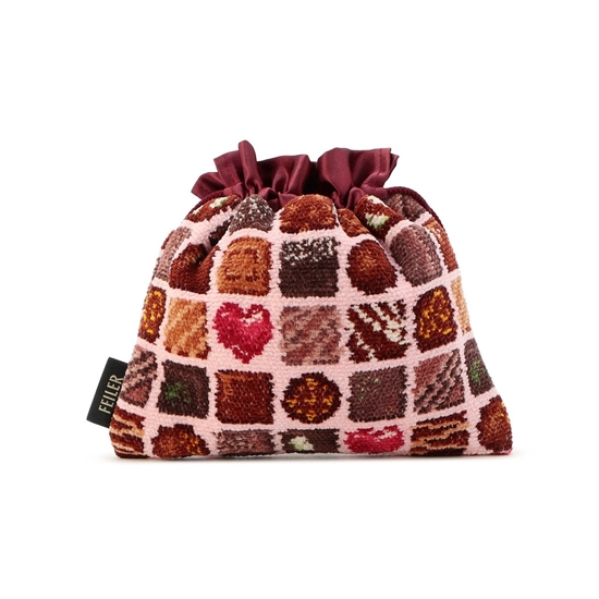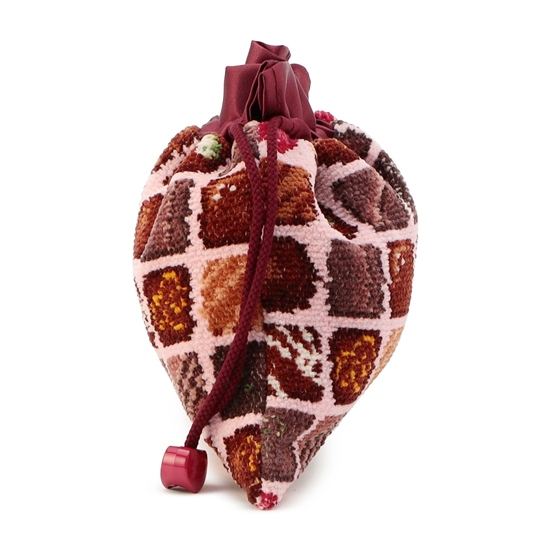 『コフレドゥショコラ』の巾着です。口元と裏地にサテン生地を採用することで、より華やかに仕立てました。巾着紐の先端にあしらった、ハート型のループエンドもアクセントに。日々のバッグの中の整理に、トラベルでの荷物の仕分けにと、幅広い用途で役立つアイテムです。