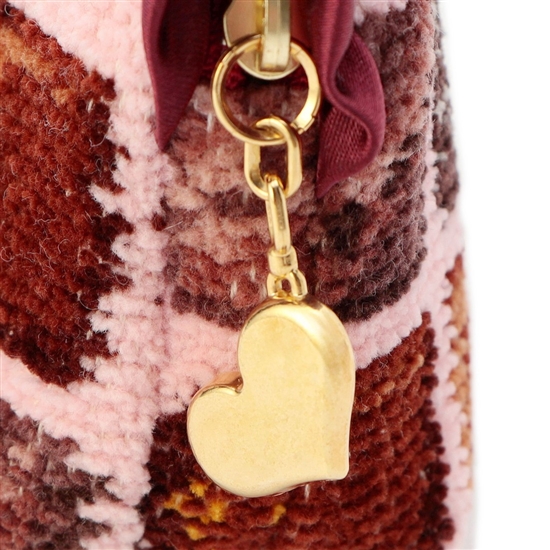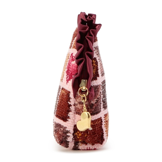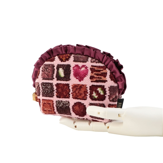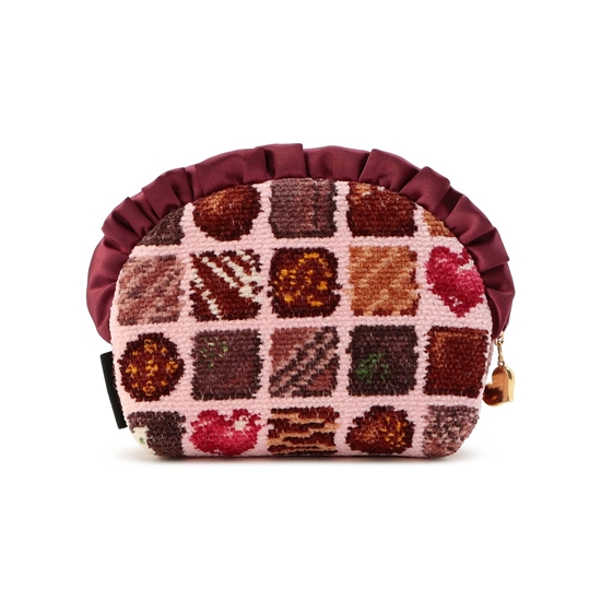 甘くとろけるような柄がたまらない『コフレドゥショコラ』のポーチです。開口部の艶やかで光沢感のあるフリルが、上品で大人かわいいポイント。内側には便利なオープンポケットが付いて、小ぶりながら小物をしっかり収納できます。コスメやモバイルグッズの収納など、さまざまな用途で活躍するアイテムです。