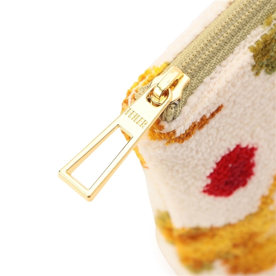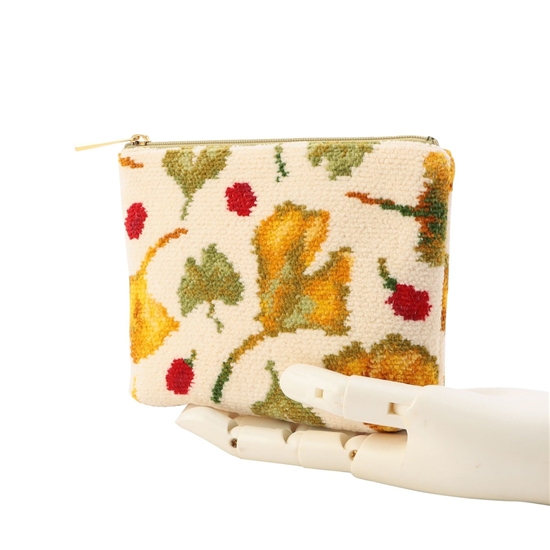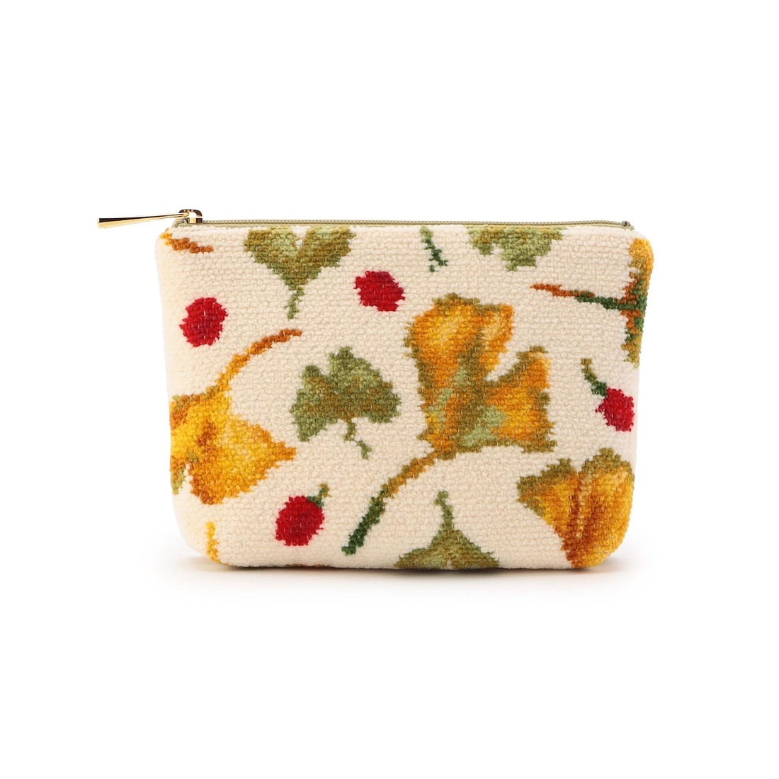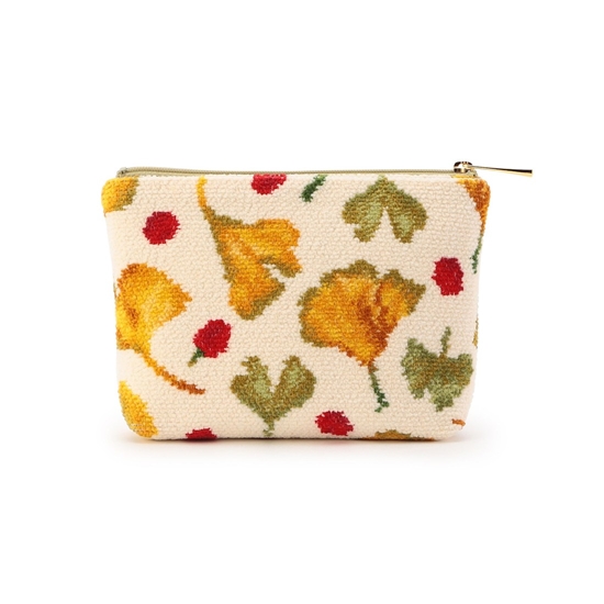 ひらひらと舞うイチョウを描いた『ギンコウツリー』のポーチ。熟した赤い銀杏をちりばめて、柄にメリハリを効かせました。コスメや目薬などの持ち運びのほか、バッグの中の荷物の整理に役立つサイズ感です。内側には仕分けをするのに便利なオープンポケットもあり、デイリーユースに重宝するアイテムです。
