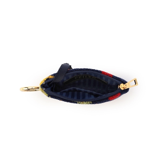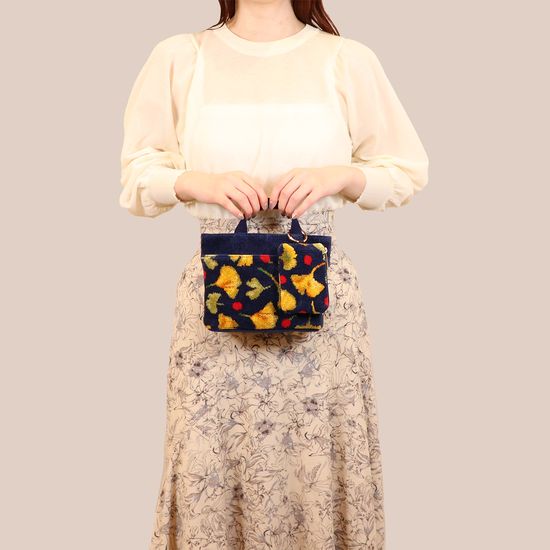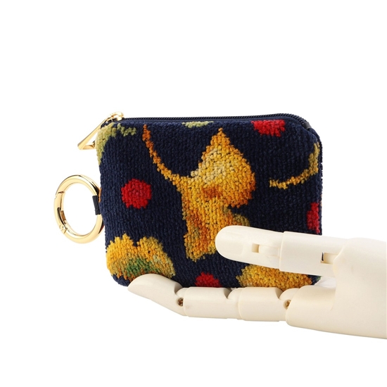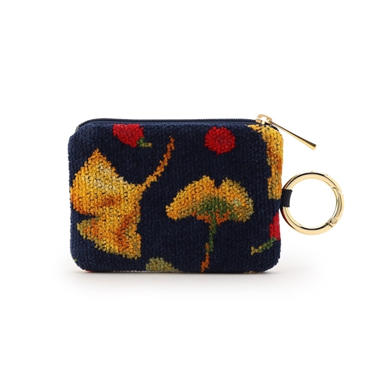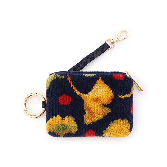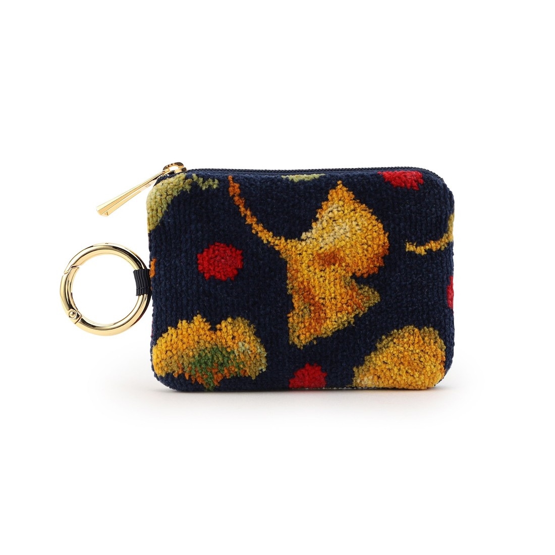 『ギンコウツリー』のキーポーチです。外側にカラビナリングをあしらい、バッグやベルトループなどにも付けられる仕様に。内側にはループ付きのナス管と、仕分けに便利なポケットを備えました。目薬やイヤホンなどのちょっとした小物類をまとめて持ち運ぶのにも重宝するアイテムです。