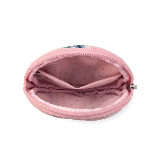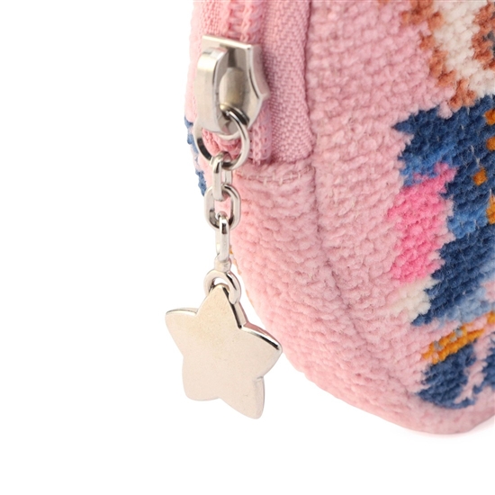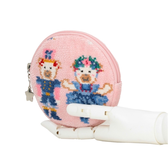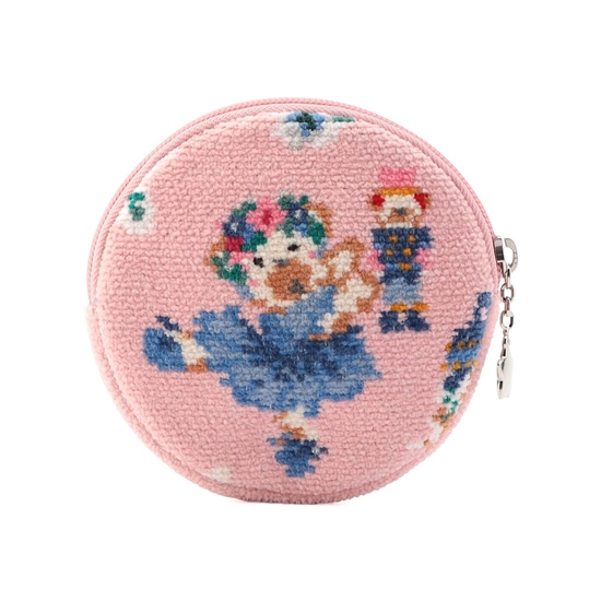 『リーベ&リリアザナットクラッカー』のサークルポーチです。手のひらほどの大きさで、ややマチ幅もあり、持ち運びしやすいのがポイント。内側には仕分けに便利なオープンポケットを備えました。リップやアクセサリー、常備薬などの収納にぴったり。思わず持ち歩きたくなるような、コンパクトで愛らしいアイテムです。
