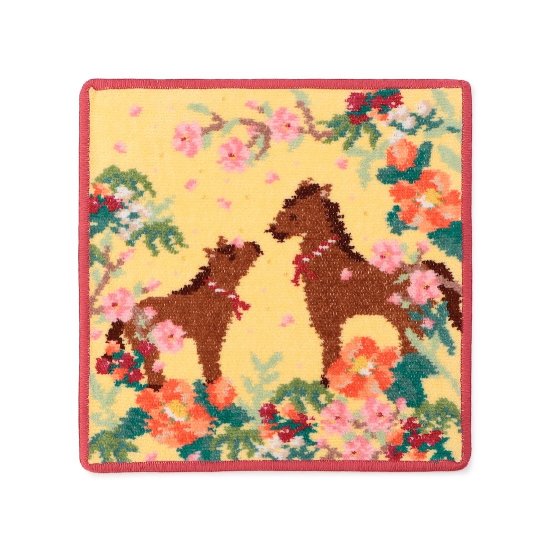 人気の干支ハンカチ。2026年午年は縁起のよい花々に囲まれて、幸せそうに新年のお祝いをしている馬の親子をデザインしました。愛らしく甘えてくる仔馬に、優しく微笑み返す母馬。今年も一緒に幸せな1年を過ごせますように。