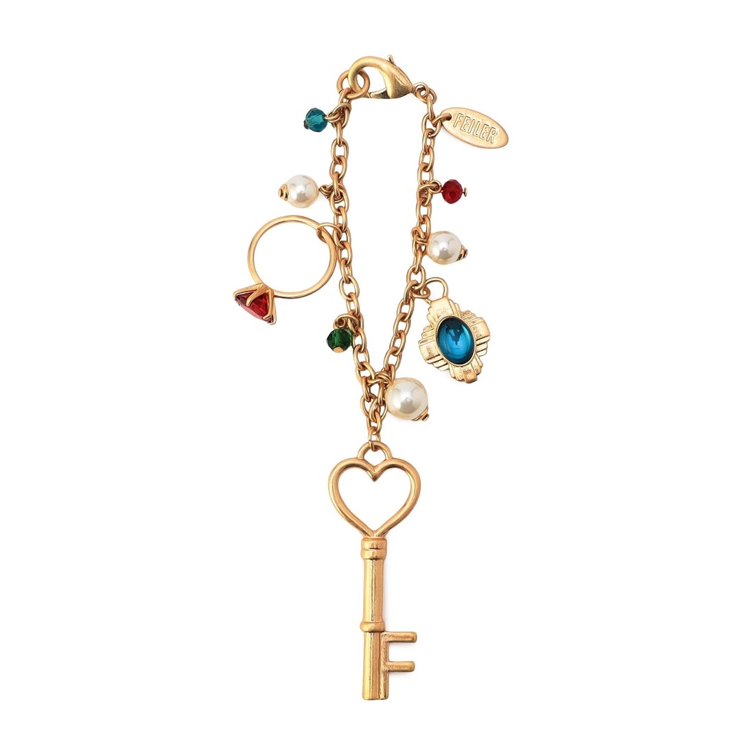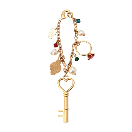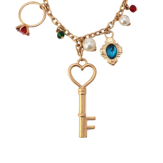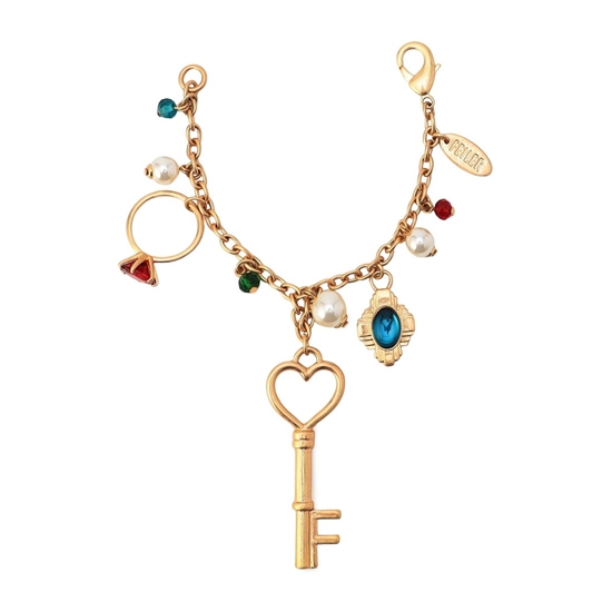 『シンス』の世界観を表現したバッグチャームです。柄の中から時代とともに受け継がれてきたジュエリーたちをピックアップ。鍵や指輪、パールのネックレスなどをあしらい、存在感のある表情に仕上げました。同柄のバッグ(SCE-260172)に付けるとより華やかな雰囲気に。ギフトのプラスワンアイテムにもいかがでしょうか。