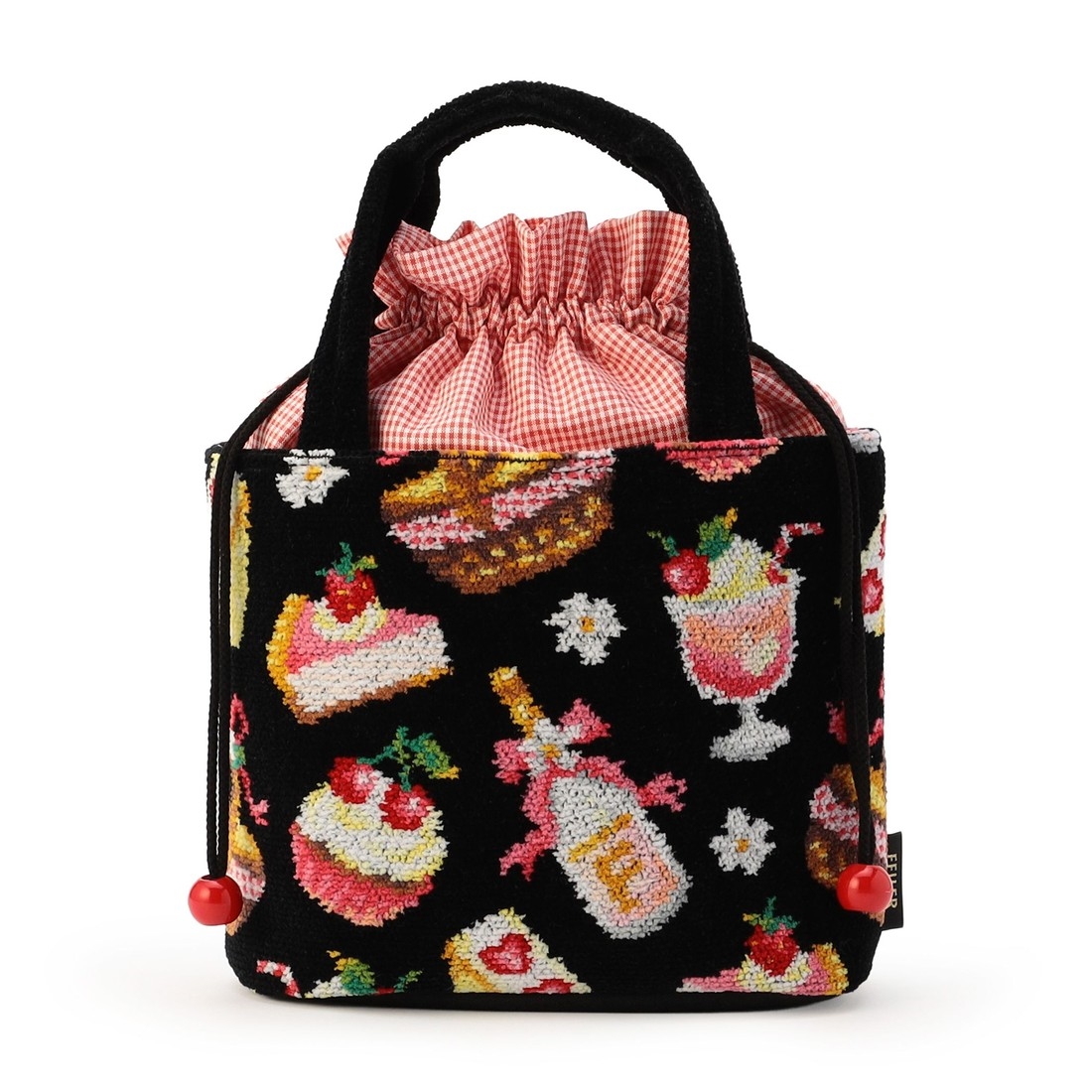 丸底で安定感のある『ベリーベリーピクニック』の巾着バッグです。ギンガムチェックの巾着生地が、キュートでかわいらしい雰囲気を演出します。必要なものだけを仕分けるのに便利な内ポケット付き。ハンドウォッシャブル仕様なのでお手入れも簡単です。普段のランチやちょっとしたお出かけなどにいかがでしょうか。
