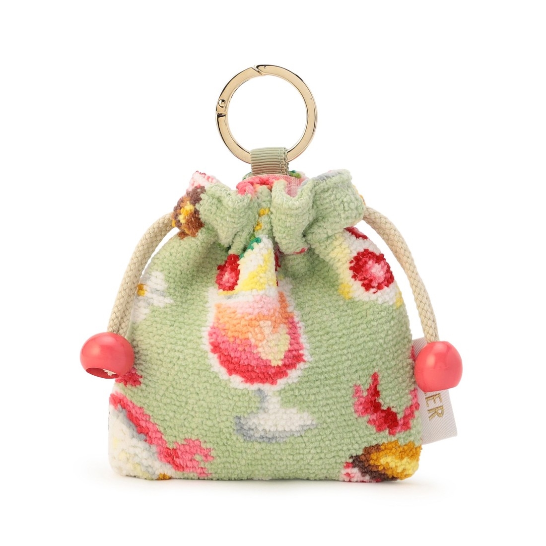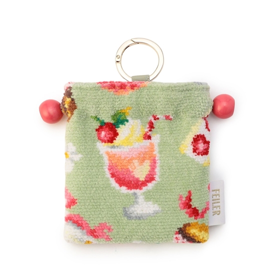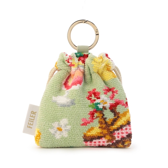 『ベリーベリーピクニック』のチャームミニ巾着です。小さくてキュートな雰囲気と、日常のちょっとした小物を持ち運ぶのに便利なサイズ感を追求しました。リング型のカラビナ付きなので、バッグのハンドルなどに付けてお使いいただけます。コーディネートのアクセントとして、お気に入りのバッグと合わせてもかわいいアイテムです。