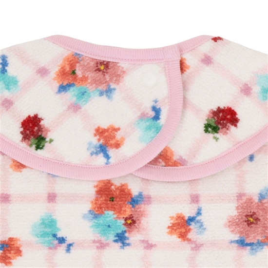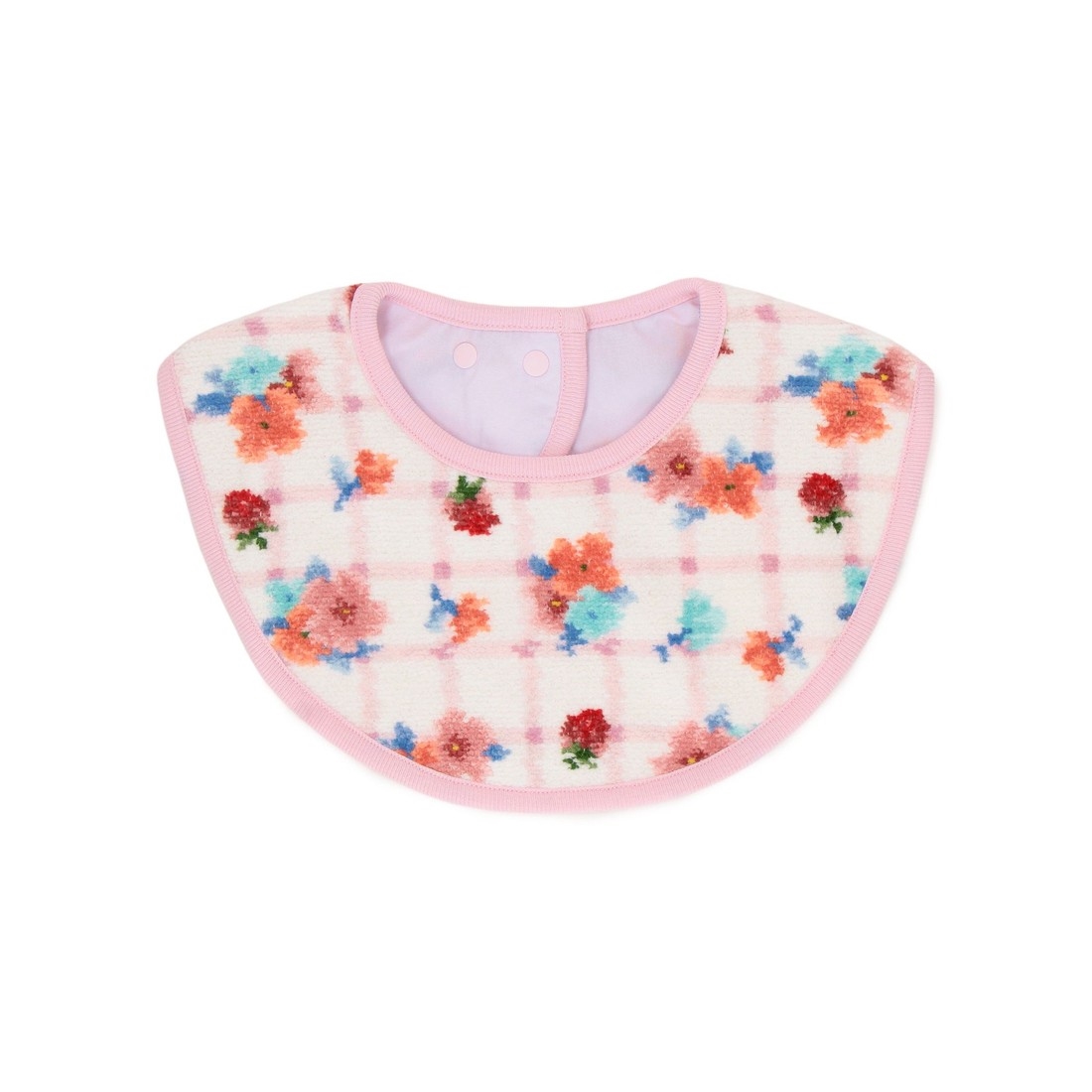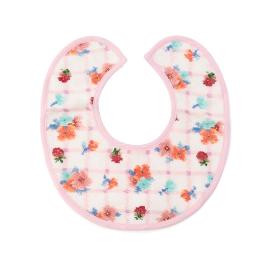 ソフトな肌触りが心地よい『ブルームブルーム』のスタイです。首の後ろでスナップボタンを留めるタイプで、2段階に調節可能。ワンタッチで簡単に着脱できて、お子さまへの負担が最小限なのもうれしいポイント。靴下(BLB-260533)やマルチケース(BLB-260523)などとセットで、出産祝いの贈り物にもおすすめです。