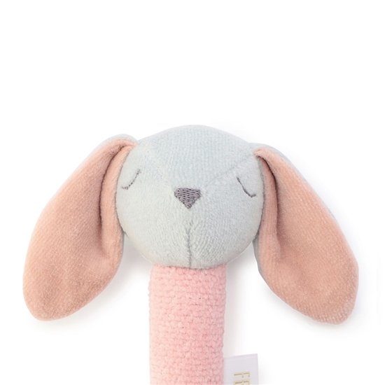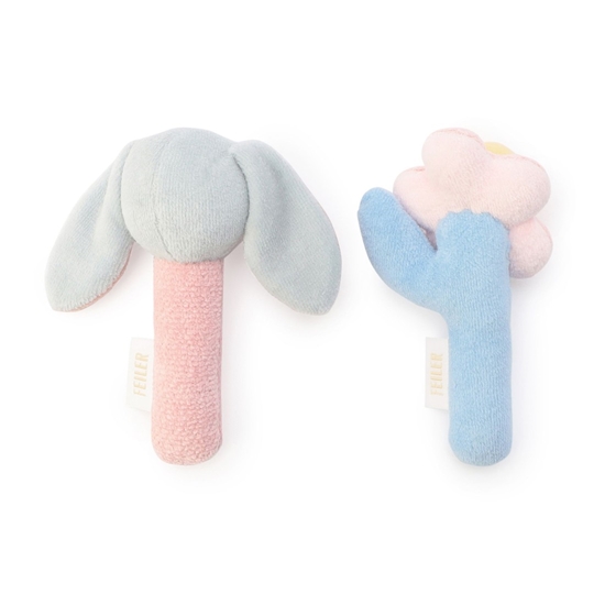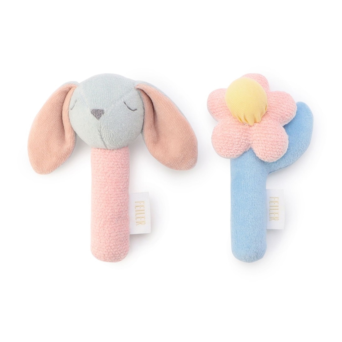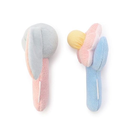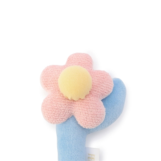 揺れるたびに音が鳴る『ブルームブルーム』のニギニギです。赤ちゃんの小さな手でも握りやすく仕上げました。シュニール織とパイル地を組み合わせた、ふんわり心地よい手触りもポイント。おそろいのマルチクリップ(BLB-260531)を付けていただくと、いつでも手元にキープしながら持ち運びができておすすめです。