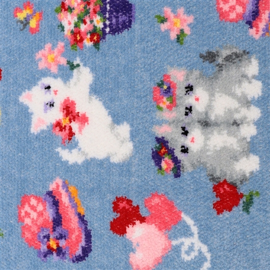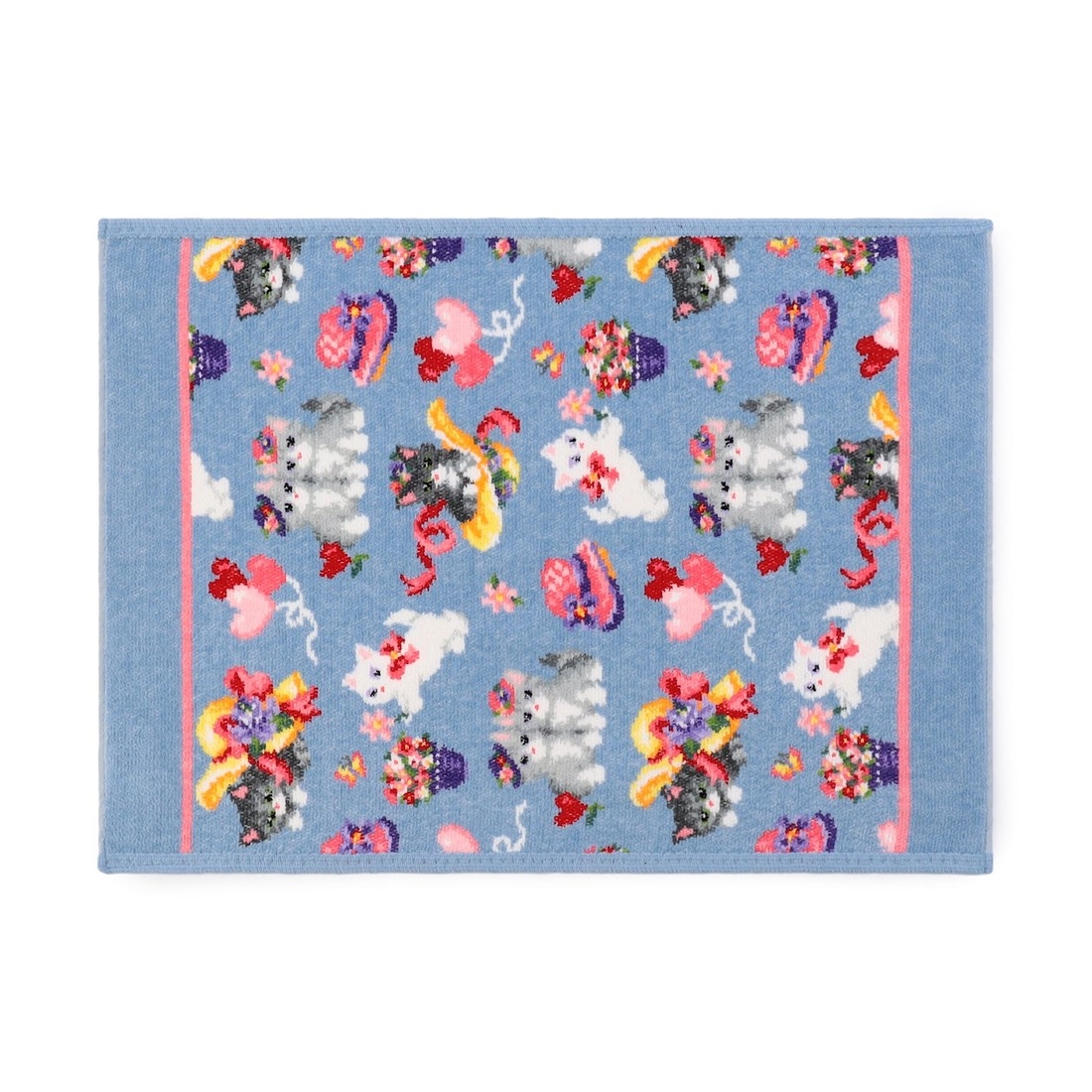『モンプティシャ』のゲストタオルです。大きな帽子に入ってみたり、ちょうちょやお花にちょっかいを出したり。ハートの形をしたお花や風船をあしらい、より楽しい雰囲気に仕立てました。タオルとしてはもちろん、ランチョンマットやピローカバーなどにもお使いいただけます。おそろいのプティバスと一緒に贈り物にもおすすめです。