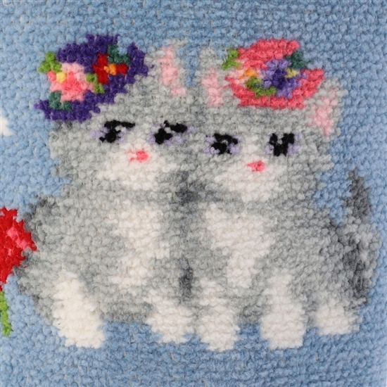 色違いの小さなシャポーをかぶったおしゃれツインズの子猫たち。ゴージャスなお帽子と夢中で遊ぶ黒猫さん。白猫さんは鉢植えのお花にいたずらするつもり?みんなの楽しい気持ちがハートの風船になって、空へと舞い上がります。