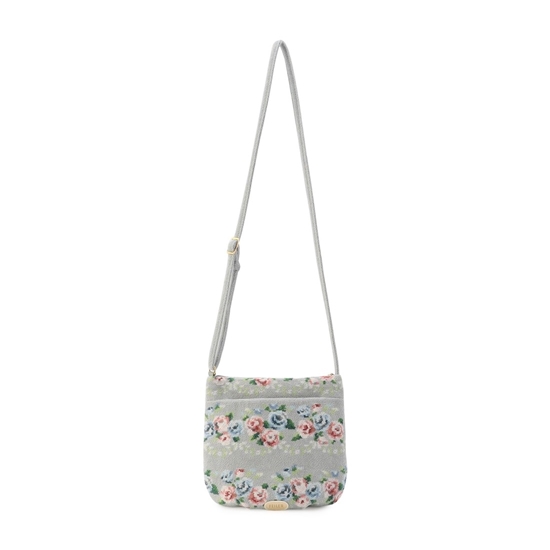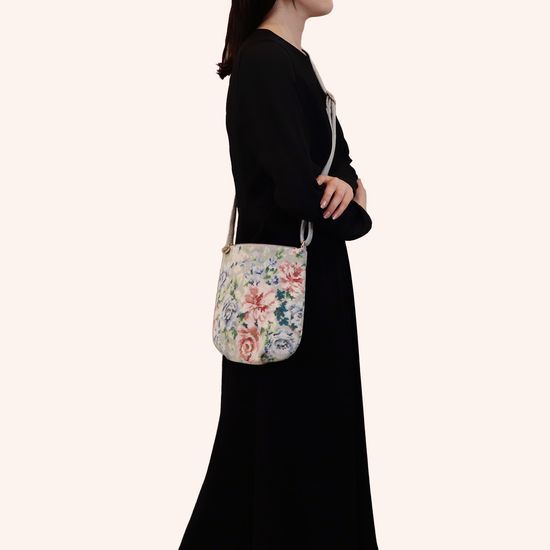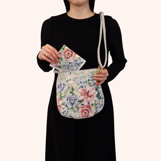 そよ風とたわむれる薔薇をやさしい表情で描いた『ノスタルジックノート』のミニショルダーバッグです。底面に僅かなふくらみを持たせることで、ふっくらとした立体感のあるシルエットに。内側と外側、それぞれオープンポケットを備えて収納力も重視しました。普段使いはもちろん、旅先で必要なものだけを持って身軽にお出かけしたいときにも重宝します。