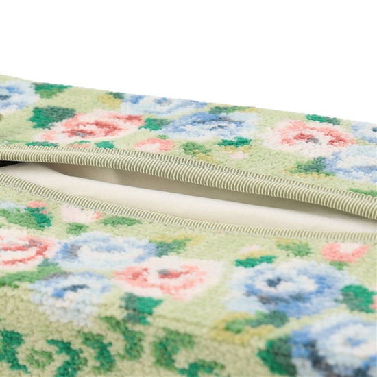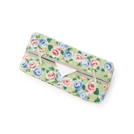 『ノスタルジックノート』のティッシュボックスカバーです。ティッシュ取り出し口の両サイドにある、2つのリボンが上品で愛らしいアクセント。ピンクやブルーの薔薇がシュニール織の風合いと相まって、お部屋をさりげなく引き立てます。テーブルや家具の上に置いて、毎日の生活に取り入れてみてはいかがでしょうか。