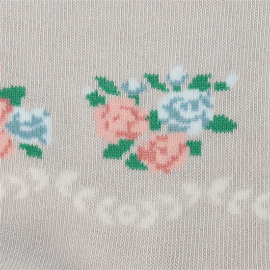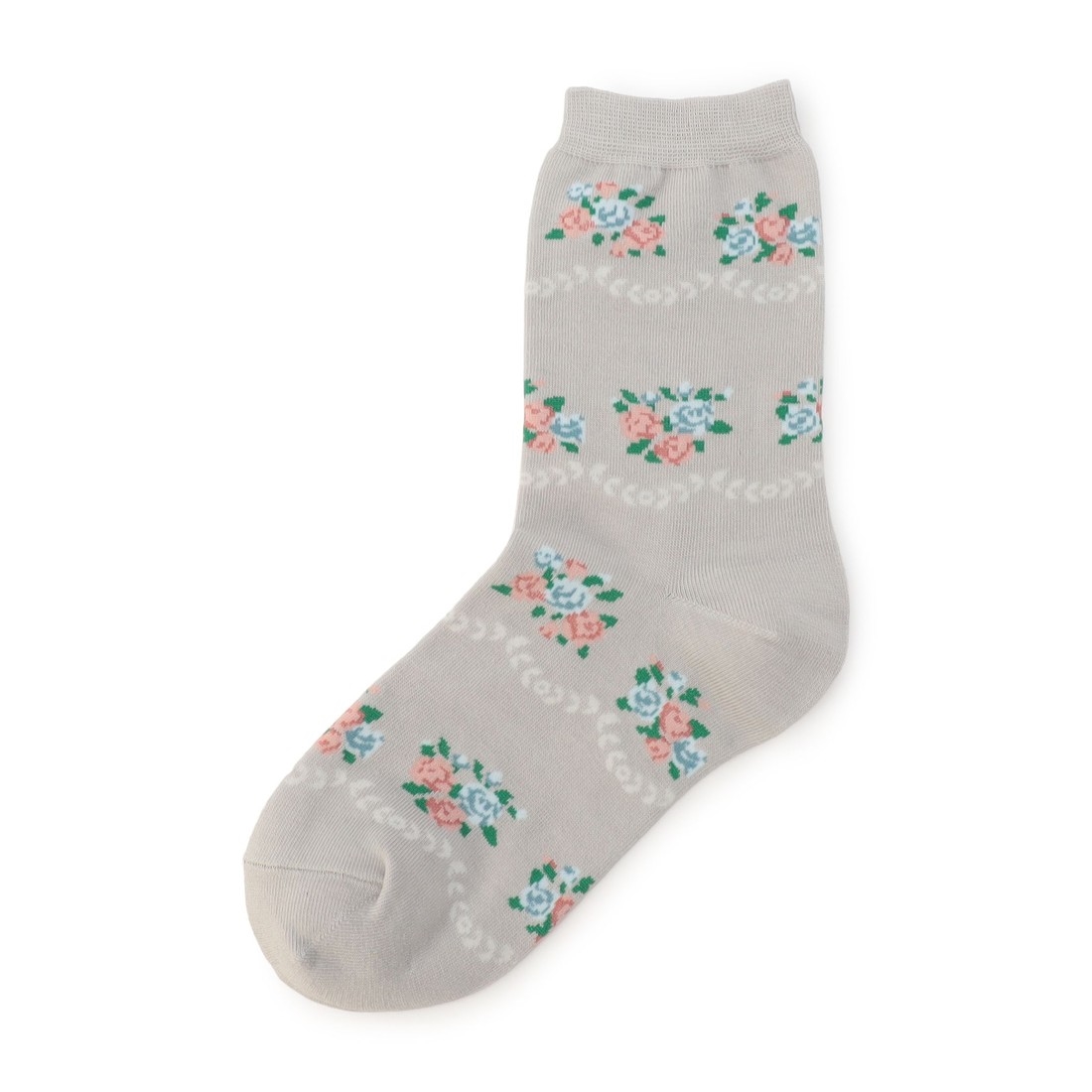 『ノスタルジックノート』の靴下です。小さなブーケを思わせる薔薇とスカラップ模様が、足元から覗かせたときのさりげないアクセントに。ベーシックなクルー丈なので、どんなコーディネートとも組み合わせ可能です。グローブ(NLN-260259)と組み合わせて、さりげなく統一感のある着こなしを楽しむのもおすすめです。
