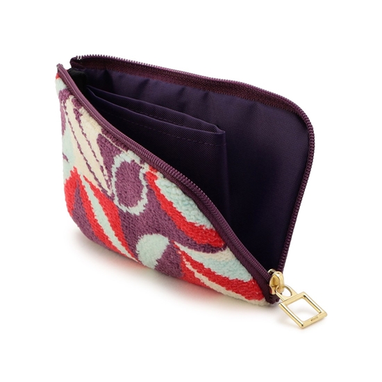 CLOUDYデザイナーが描いたパターンによる『クラウディネイチャーブルーム』のフラグメントケースです。複数のカードと必要最低限の現金を持ち運ぶときに重宝する、ミニマルなサイズ感に仕立てました。内側中央には挟み込みタイプのポケットがあり、鍵などの貴重品も収納可能。L字ファスナー開閉で取り出しやすく、お財布代わりにお使いいただけるアイテムです。