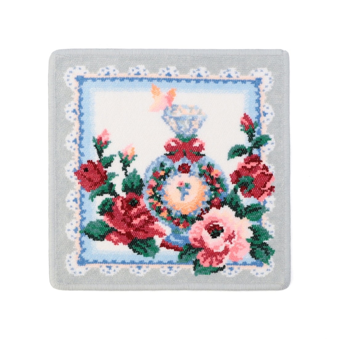 4月の誕生石ダイヤモンドから着想を得た『マイジュエルエイプリル』のハンカチです。香水瓶の周囲に誕生花の薔薇とレース模様を組み合わせて、ロマンティックな雰囲気に。いまにもうっとりするような香りが漂ってきそうな魅力溢れる1枚です。ご自身へのご褒美や、誕生月の方へのギフトにもいかがでしょうか。