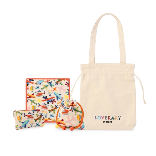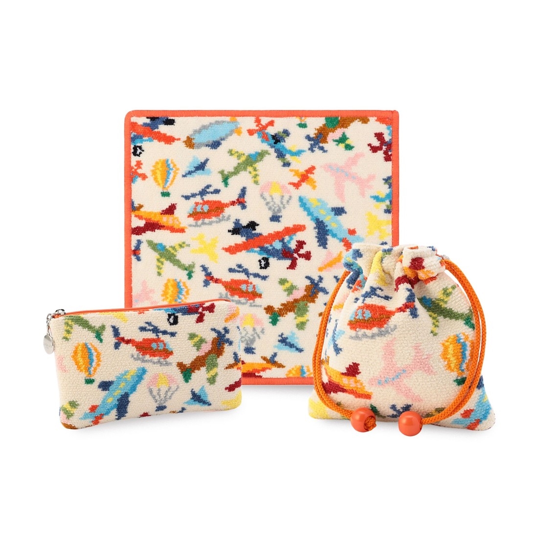 『ブンブンヒコーキ』の2026年福袋です。ハンカチ、ポーチ、巾着をセットにしました。LOVEARY BY FEILER のロゴ入り専用外袋付きです。使うたびにワクワクするような、さまざまな航空機が描かれた魅力的なアイテム。カラフルな色彩も気分を盛り上げます。ユニセックスに使える福袋です。