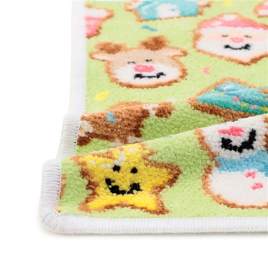 『クリスマスクッキーズ』のハンカチです。サンタさんやトナカイ、ツリー、靴下など、クリスマスモチーフのアイシングクッキーを描きました。にっこりとした笑顔と目が合えば、こちらも思わず微笑んでしまいそう。やわらかいカラフルな色彩も魅力のポイント。クリスマスのちょっとしたギフトとして選んでみてはいかがでしょうか。