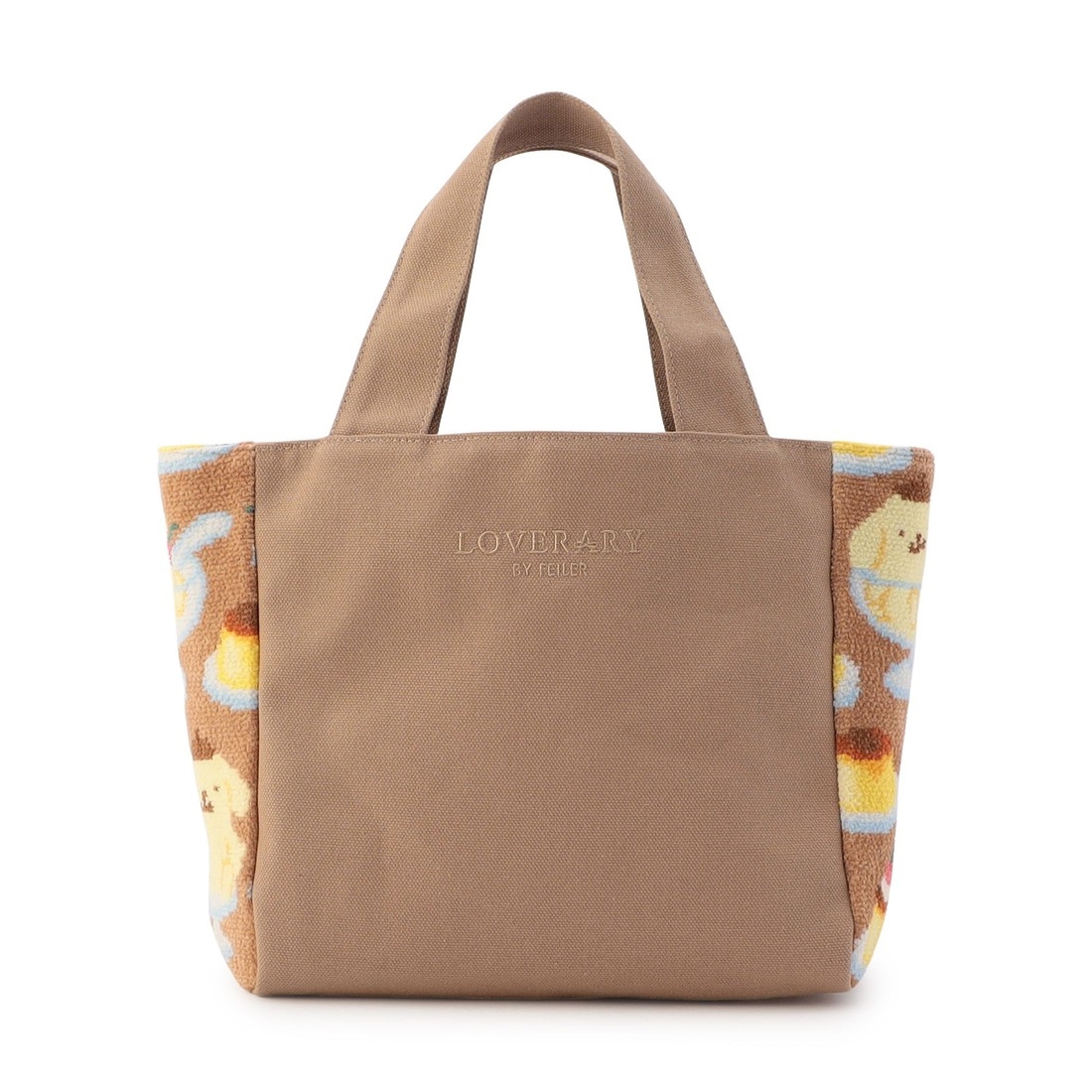 サイドにかわいい『ポムポムプリン プディング』柄をあしらったトートバッグです。フロントを無地にすることで、同柄のポーチが映えるデザインに。さりげなく入ったロゴ刺しゅうもポイントです。内側には便利なオープンポケットも。ちょっとしたお出かけにおすすめの一品です。