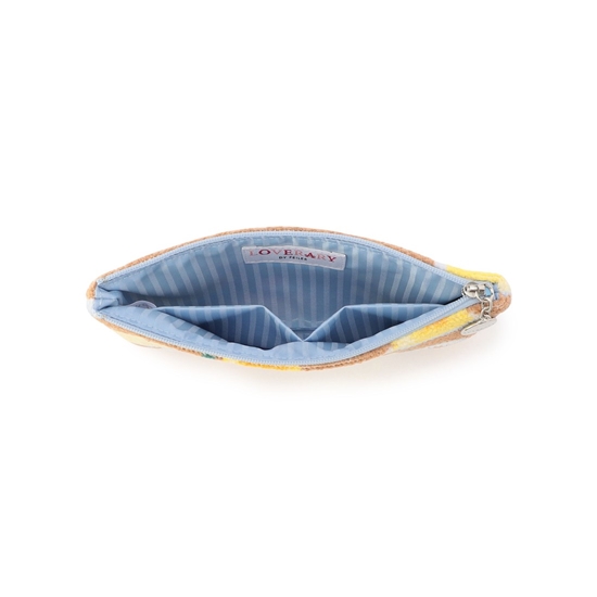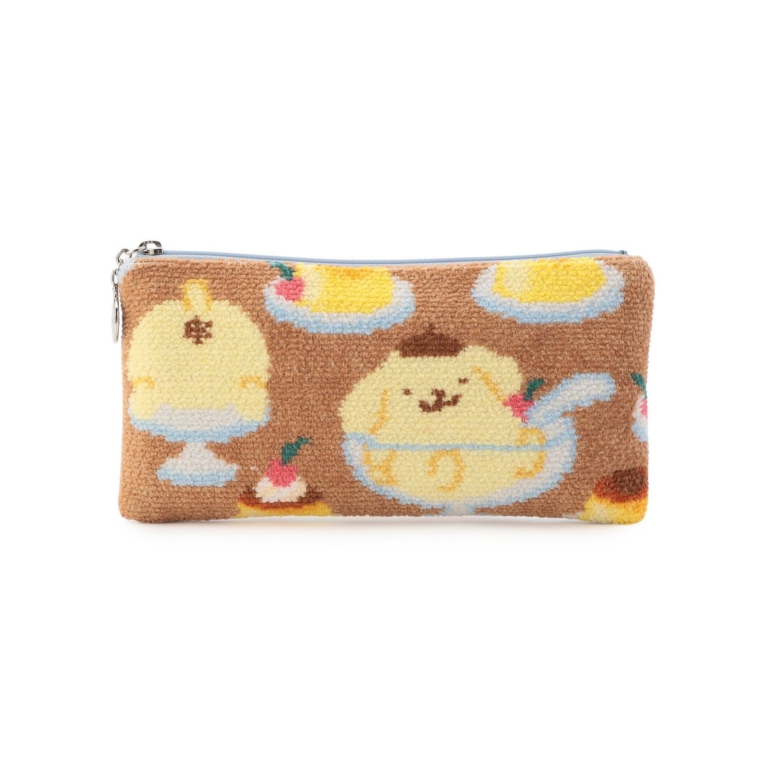 『ポムポムプリン プディング』のフラットポーチです。スイーツのプリンに並んで、ちゃっかりガラスの器に収まる「ポムポムプリン」。内生地をブルーのストライプ柄にして、爽やかに仕上げました。文房具を入れたり、コスメ道具を入れたりとさまざまな用途で活躍する一品です。