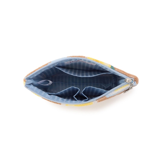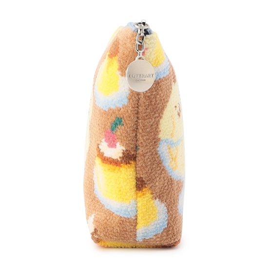 たくさんのプリンに囲まれた「ポムポムプリン」がかわいらしい『ポムポムプリン プディング』の舟型ポーチです。ファスナーにはロゴ入りのラウンドチャームをあしらいました。内生地にストライプ柄を採用し、見えにくい部分もおしゃれに。コスメやモバイルグッズ、トラベルグッズなどを入れるのに重宝する一品です。