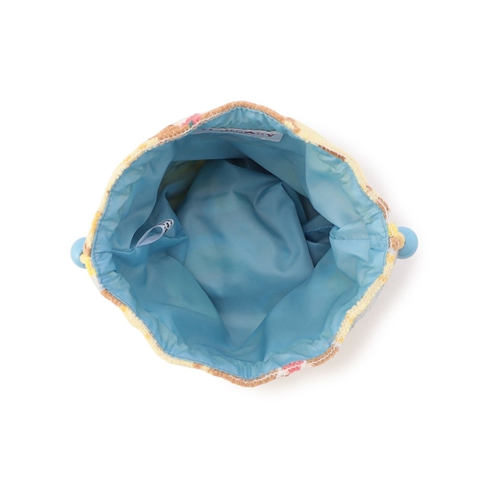 スイーツのプリンと「ポムポムプリン」が並んだ『ポムポムプリン プディング』の巾着です。裏地を爽やかなブルーのバイカラーにして、開けたときにも気分が上がるポイントに。紐留めは裏地に合わせてブルーをチョイスしました。コスメやお菓子、モバイルグッズなどを入れられる、さまざまな用途で活躍する一品です。
