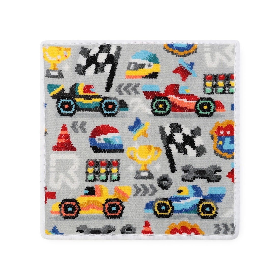 『ラブラリーサーキット』のハンカチです。色鮮やかな車体のレーシングカー、躍動感あるチェッカーフラッグやクールなヘルメットに、トロフィー、三角コーン。サーキットを思わせる、遊び心のあるかっこいい柄に仕上げました。男女問わず車好きな人に贈りたい、おすすめの一品。