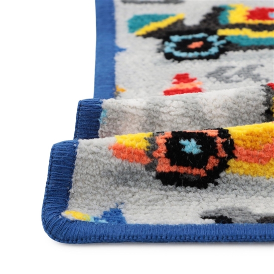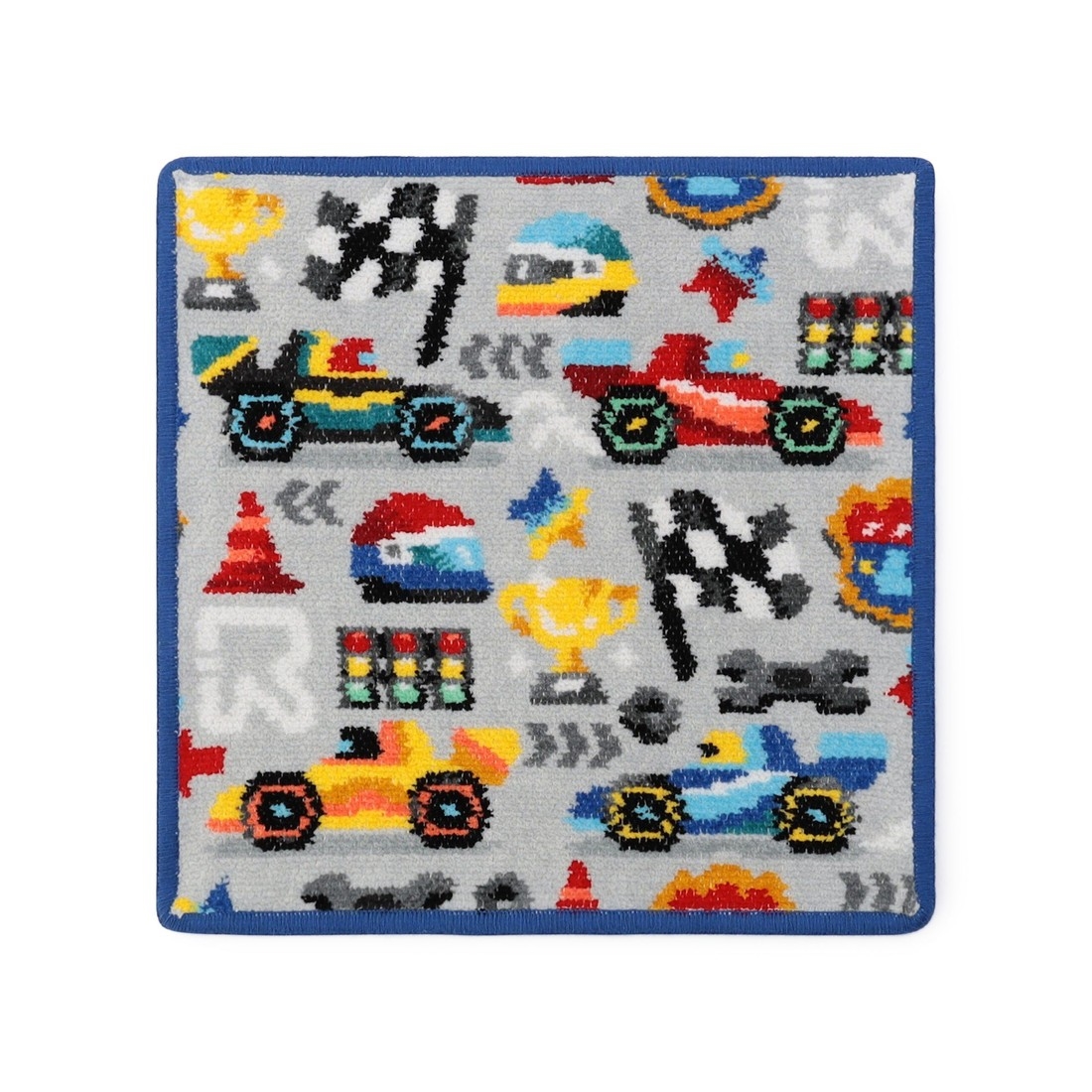 『ラブラリーサーキット』のハンカチです。色鮮やかな車体のレーシングカー、躍動感あるチェッカーフラッグやクールなヘルメットに、トロフィー、三角コーン。サーキットを思わせる、遊び心のあるかっこいい柄に仕上げました。男女問わず車好きな人に贈りたい、おすすめの一品。