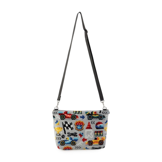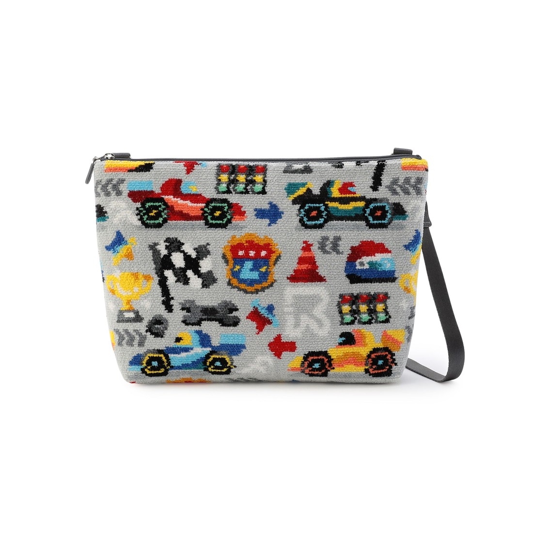 カラフルでクールなレーシングカーに視線が集まる『ラブラリーサーキット』のショルダーバッグです。ヘルメットやチェッカーフラッグ、トロフィーなど、サーキットに欠かせないさまざまなアイテムをちりばめました。口元はファスナー仕様で、貴重品を安心して収納できます。取り外し可能なショルダーベルトや内側にオープンポケットをあしらうなど、実用性に優れた一品に仕上げました。
