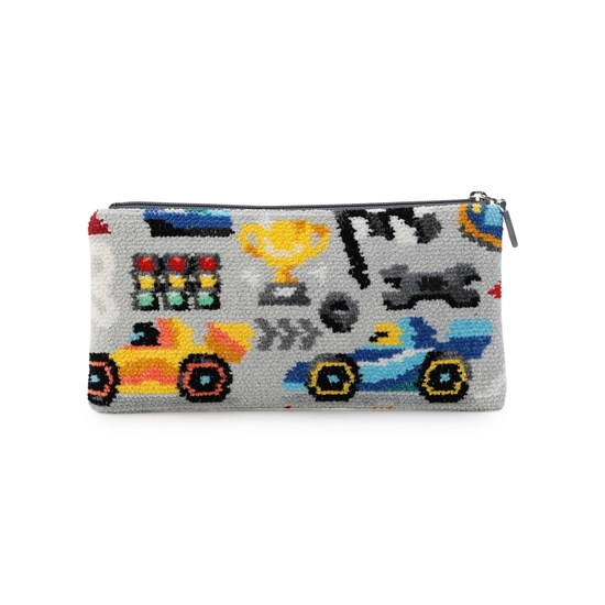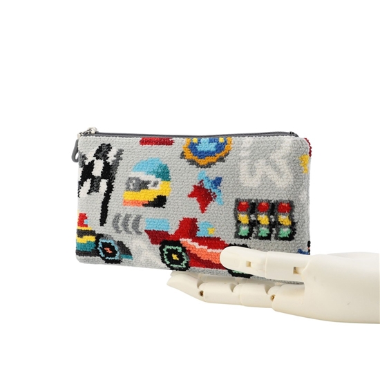 『ラブラリーサーキット』のフラットポーチです。チェッカーフラッグやヘルメット、トロフィー、などさまざまなアイテムが、躍動感あふれるレースの世界を作ります。横に長い形を採用し車が走る様子を表現しました。ペンケースやメイクツールの収納に重宝します。車好きな方へのギフトとしてぜひ選んでいただきたい一品です。