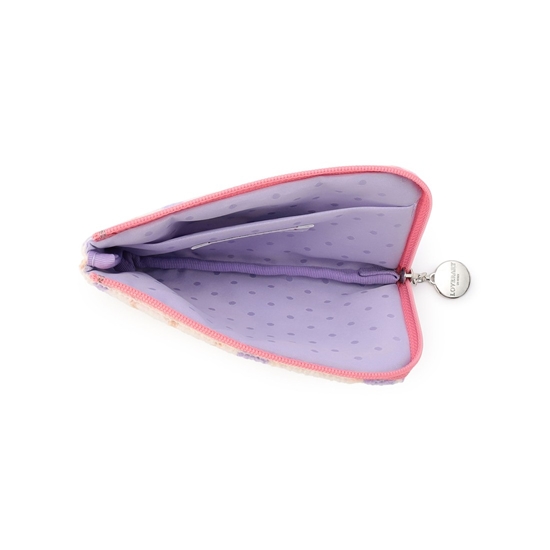 リボンをつけて、おめかししたネコたちを描いた『モフモフネコチャン』のL字ポーチ。間口が大きく開くため中身を出し入れしやすく、小ぶりなサイズで持ち運びにも便利です。内部はかわいいドット柄の生地を採用し、オープンポケットも施しました。小銭やカード、イヤホン、リップ、常備薬などの収納にぴったりな一品です。