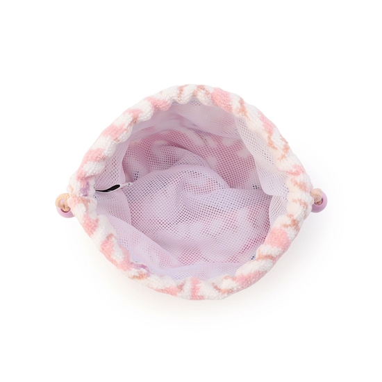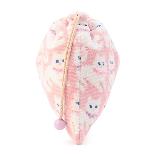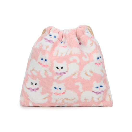 かわいらしいネコたちを描いた『モフモフネコチャン』の巾着。裏地にメッシュ素材を使用し、通気性よく仕上げています。使いやすい適度なサイズ感にしました。手洗い可能も嬉しいポイントのひとつ。トラベルグッズやモバイルグッズを入れたり、コスメやバッグ内の小物をまとめたりと、様々な用途で活躍します。