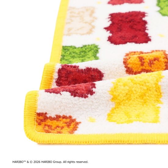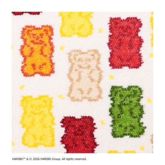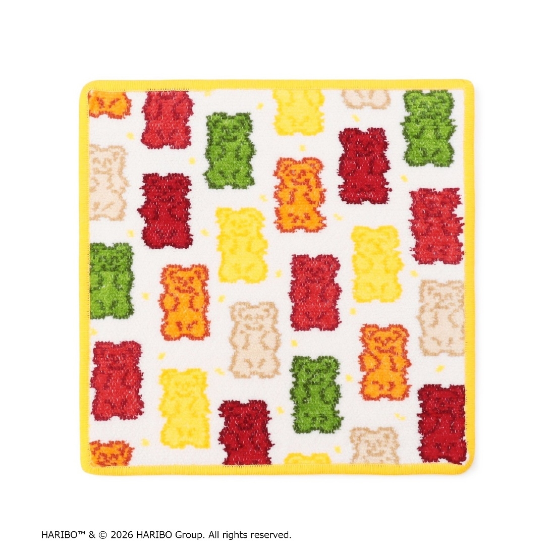世界中で愛される『ハリボーゴールドベア』がモチーフのハンカチです。6種類のカラフルなフレーバーに、ドットを組み合わせて明るい雰囲気に仕上げました。シュニール織ならではやわらかな風合いと発色性をお楽しみいただけます。