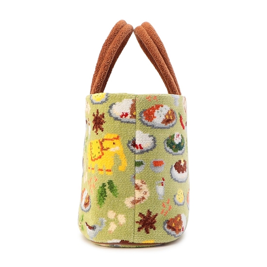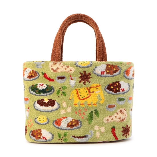 ユニークで遊び心たっぷりな『ヒガワリカレー』の巾着付きバッグ。カレーをイメージしたカラーを背景に、ナンやスパイス、ゾウなど様々な柄を散りばめました。底マチがあり、巾着付きのためランチバッグとしても実用性に優れたアイテム。荷物が多い日にはサブバッグとして小物類の収納にも便利な一品です。