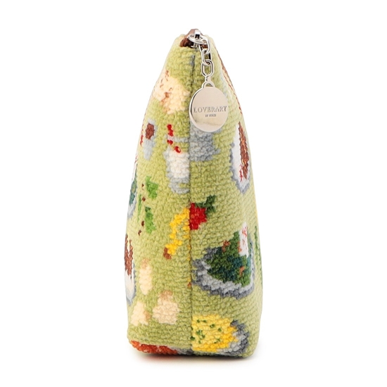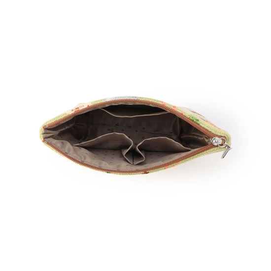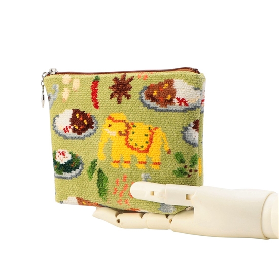 おいしそうなスパイスカレーが並んだ『ヒガワリカレー』舟型ポーチM。間口が大きく開くファスナー仕様で、内側には3つのポケットを配しました。ナンやスパイスなど、カレーの香りが今にも漂いそうな遊び心たっぷりの一品。トラベルポーチやマストアイテムの収納にもおすすめです。