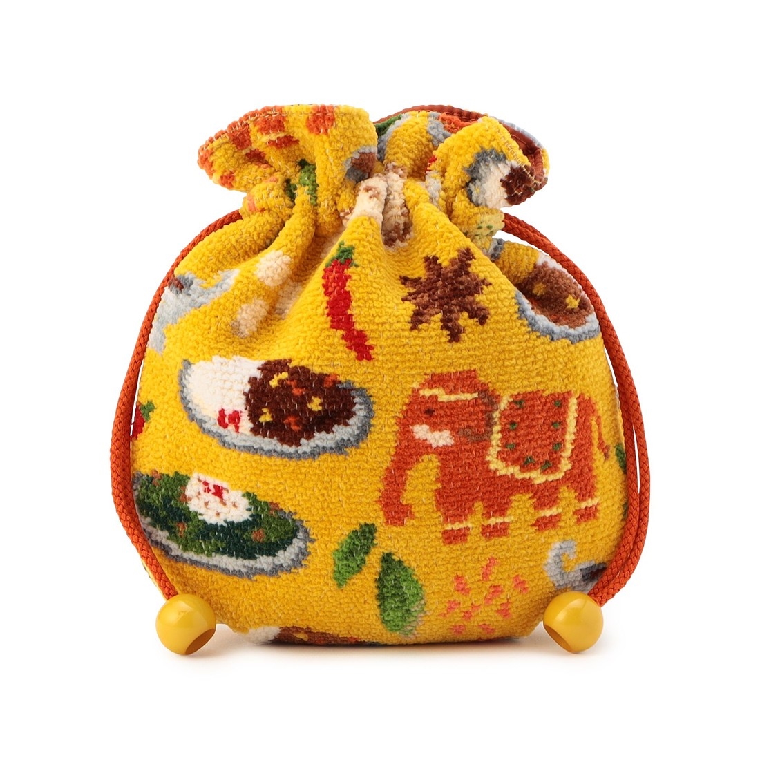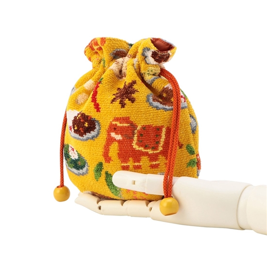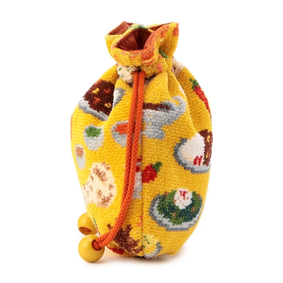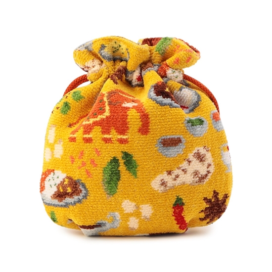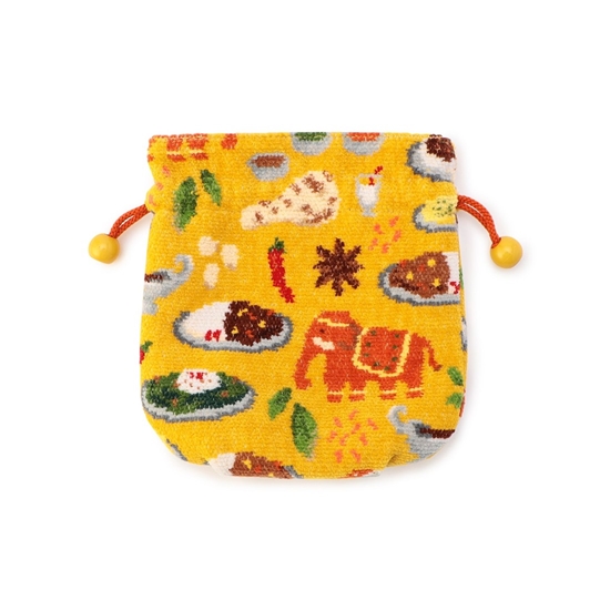 ころんとした丸いフォルムがかわいらしい『ヒガワリカレー』の巾着。カレーのイメージにぴったりなイエローをベースカラーにしました。ナンやスパイス、ゾウなど、カレーにまつわる様々な柄を散りばめた、遊び心たっぷりの一品。形が柔軟に変化するので、小さめバッグの日にも重宝するアイテムです。
