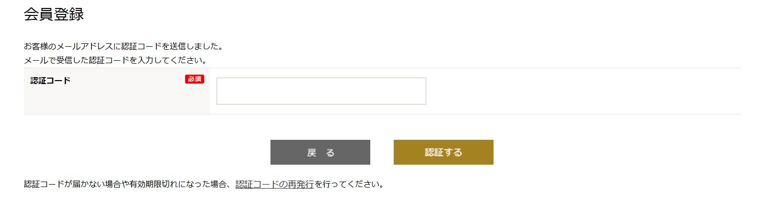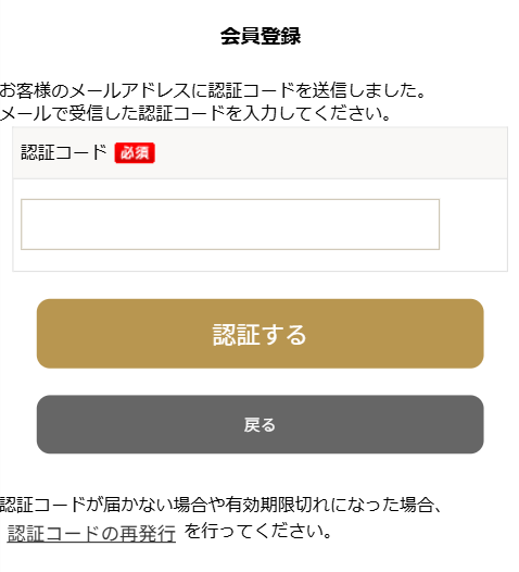 3入力したメールアドレスに届いたメール(会員登録手続きのご案内)に記載されている認証コードを入力し「認証する」ボタンをクリックして会員情報の登録へ進んでください。