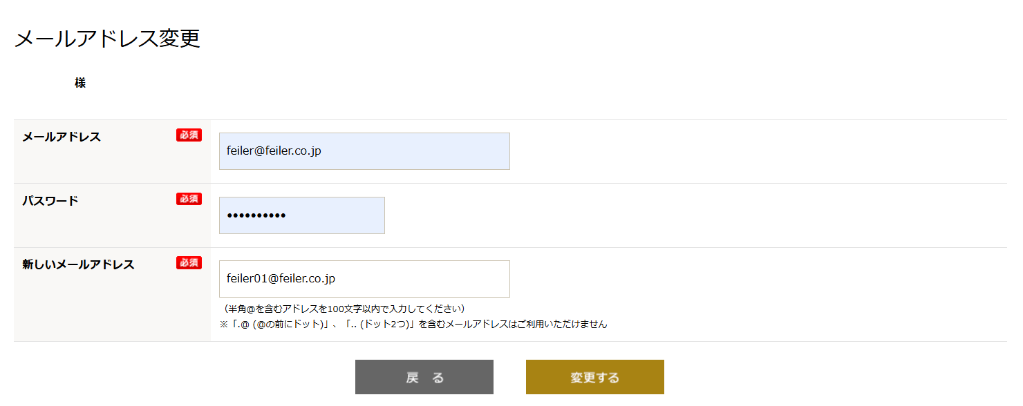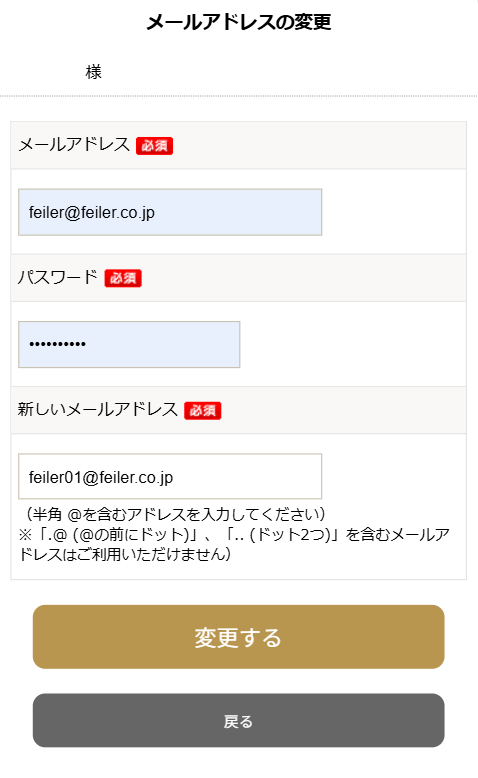 1現在ご登録の登録メールアドレス、パスワード、新メールアドレスを入力して「変更する」ボタンをクリックしてください。