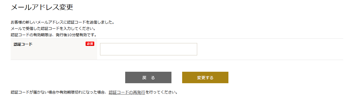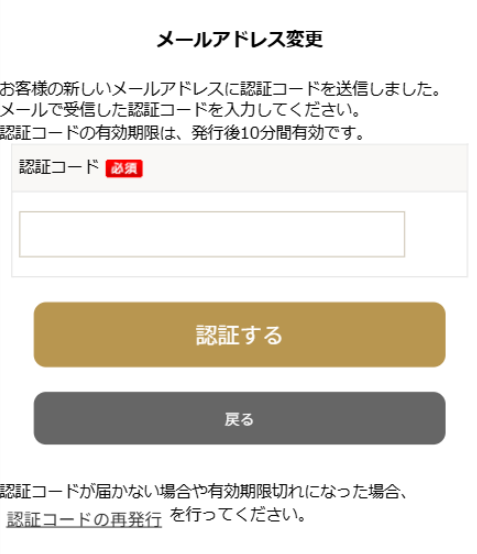 2新メールアドレスに届いたメール(メールアドレス変更手続きのご案内)に記載されている認証コードを入力し「認証する」ボタンをクリックしてください。